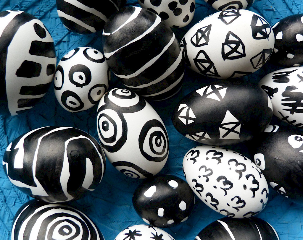 Eine große Menge an Hühner- und Gänseeiern laden uns ein, mit verschiedensten Farben und Stiften, mit Tusche, Wachsmalerei, Kratz- und Collagetechniken die fantasievollsten Ostereier zu erschaffen.