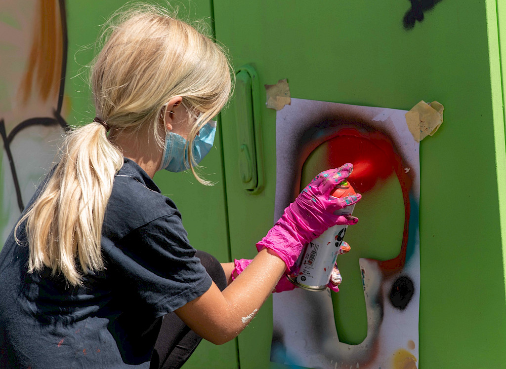 In diesem Jahr stellt uns die Westenergie eine Trafostation in Düngenheim zur Verfügung. Gemeinsam werden wir am ersten Tag mit Zeichenübungen starten und Ideen für das Wandbild sammeln. Am nächsten Tag geht es direkt an der Trafostation los. Grundtechniken des Sprayens stehen genauso auf dem Programm wie fröhlich-farbiges Ausprobieren...