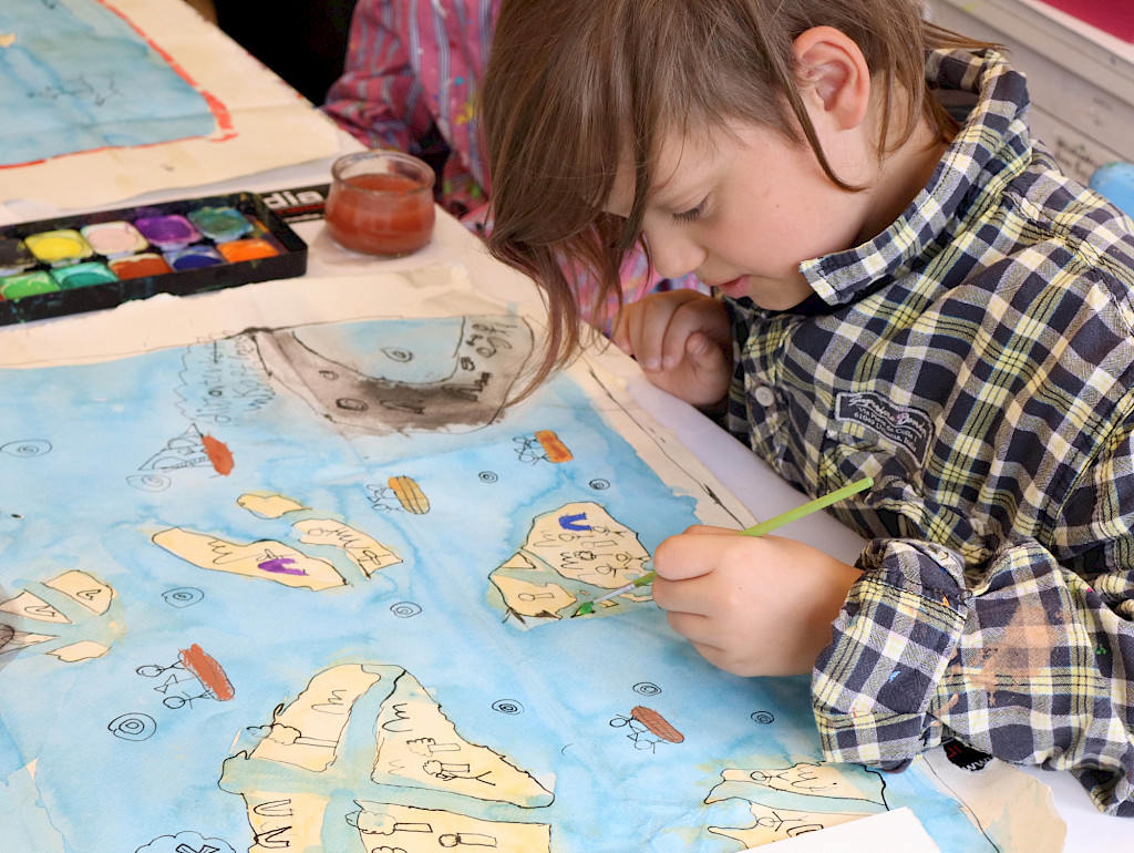 Wir malen, zeichnen, drucken, collagieren und bauen Skulpturen aus den unterschiedlichsten Materialien. Dabei können alle in ihrer eigenen Geschwindigkeit arbeiten, mit ausreichend Raum zum Ausprobieren und Experimentieren.